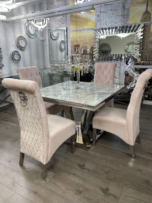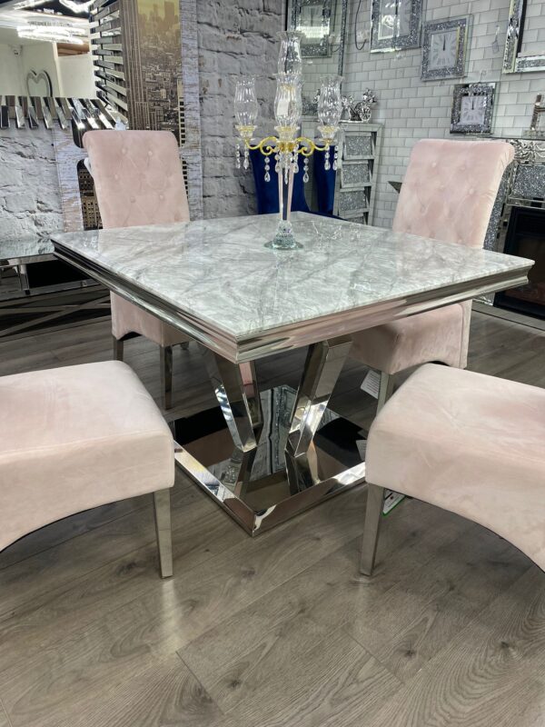 A mirrored steel frame with a diamond base holds a beautiful piece of grey marble.