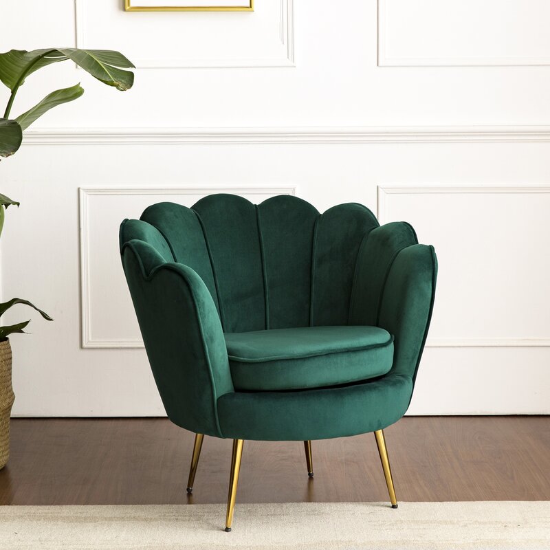 - Shell-edged tub chair upholstered with dark green velvet paired with steel gold legs.