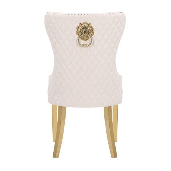 A prominent lion knocker features the back of the chair for a little added luxury.