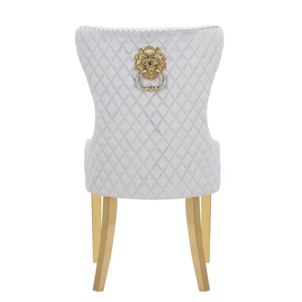 A prominent lion knocker features the back of the chair for a little added luxury.