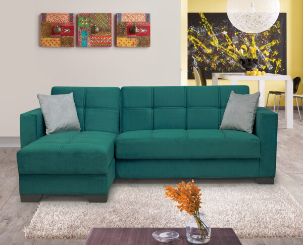 This Emerald Green sofa comes with two rectangular grey pillows, chrome finished legs and additional storage underneath.
