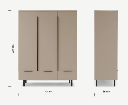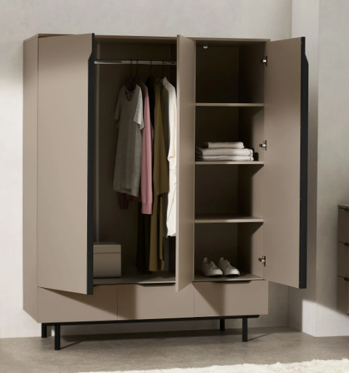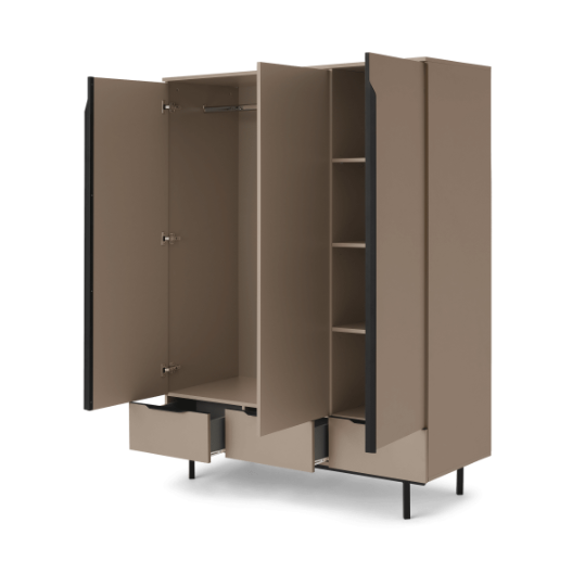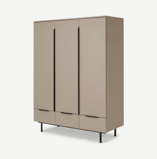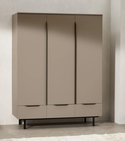 A triple wooden wardrobe with a mocha coloured finish and black handle details and legs.