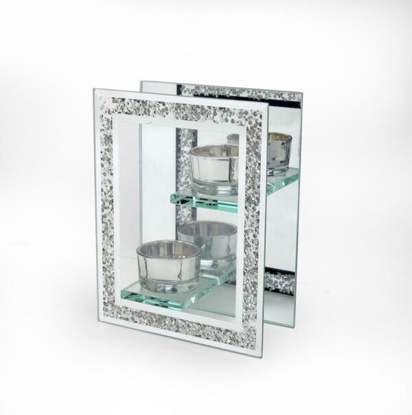 2 Tealight holders float in the centre of clear glass and a mirrored back.