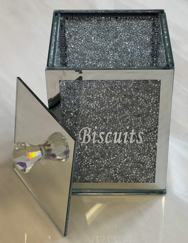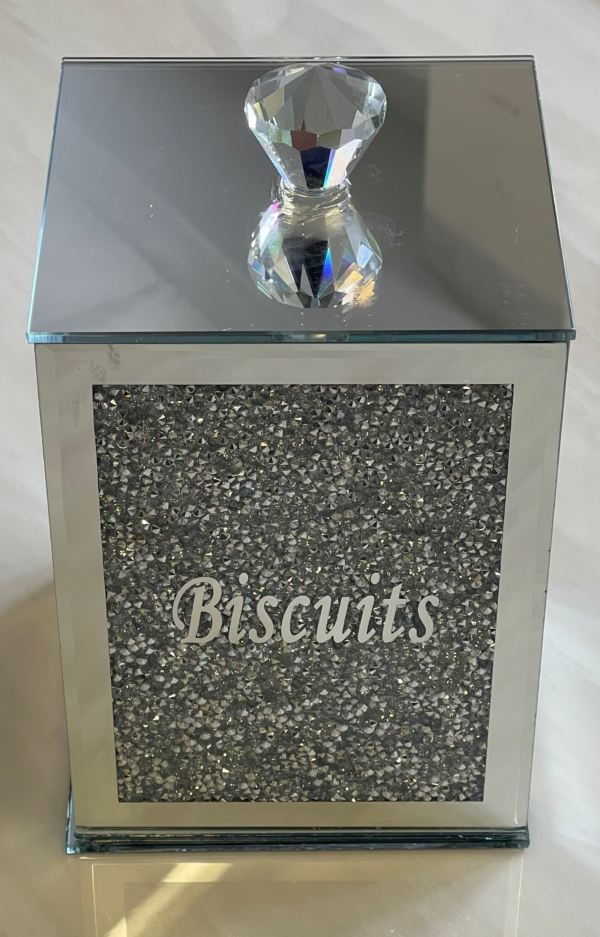 A mirrored, diamond crush biscuit tin. Perfect for kitchen usage and similarly in all living areas.