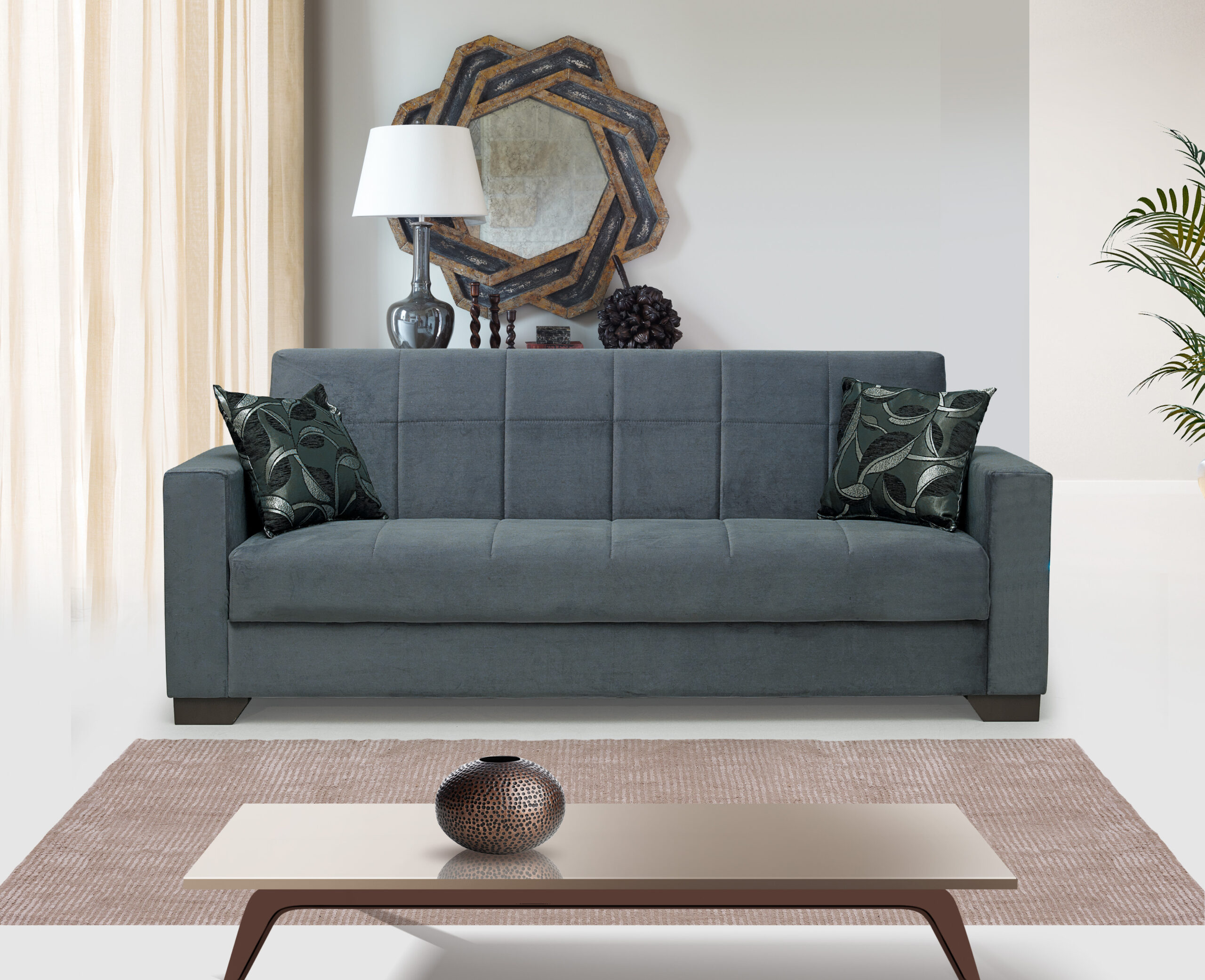 Be the first to review “Vermont Dark Grey Plush Velvet Sofa Bed with Grey Patterned Pillows”